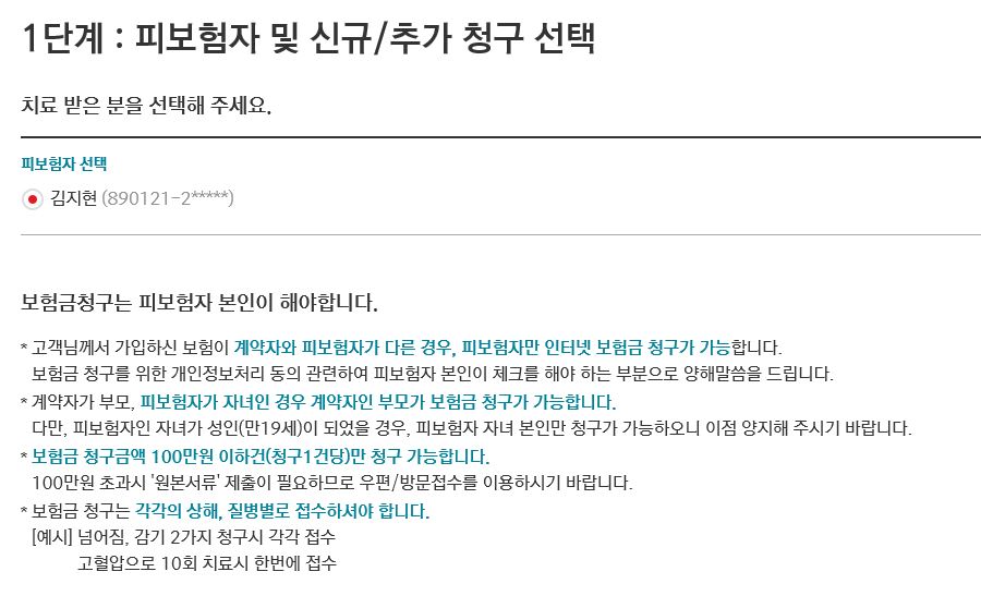 5. 본인인증 로그인하면 피보험자의 신규/추가 청구를 할 수 있다. 보험금 청구는 만 19세 미만의 자녀 외에는 본인이 보험금을 청구해야 한다. 19세 미만의 피보험자도 성인(19세 이상)이 되면 자녀 본인이 직접 신청해야 한다.